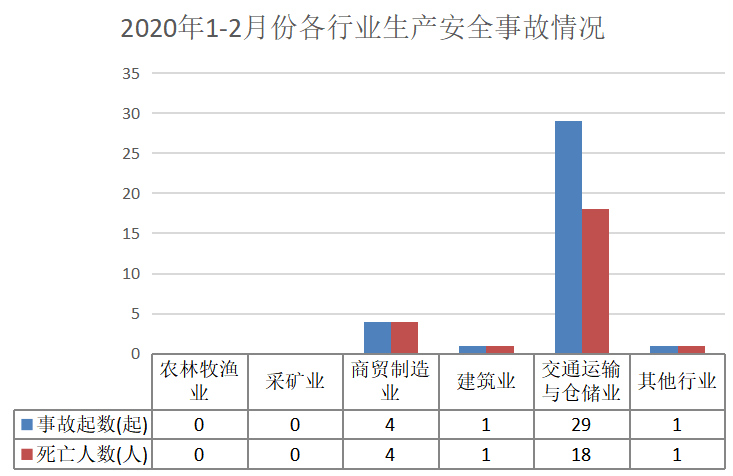 4.交通运输与仓储业。1-2月份发生生产安全事故29起、死亡18人,事故起数、死亡人数同比减少13起,减少7人,均为道路运输事故。