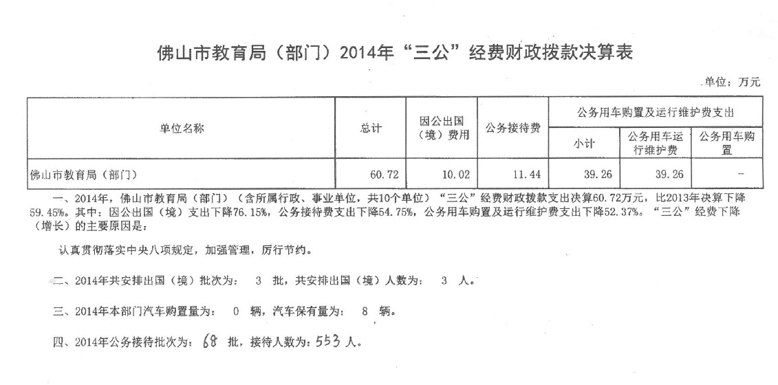 2014年 “三公”经费财政拨款决算合计60.72万元。其中:因公出国(境)支出10.02万元,占16.5%;公务用车购置及运行维护费支出39.26万元(包括:公务用车购置费0万元、公务用车运行费39.26万元),占64.66%;公务接待费支出11.44万元,占18.84%。